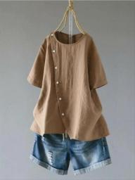 2020 Summer Plus Size Tops Leisure Casual Short Sleeve Solid Color Irregular Oblique Button Loose Comfort Simple Women Clothes