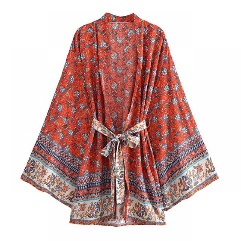 Boho Queens Floral Print Sashes Kimono Women Bohemian V Neck Batwing Sleeves Rayon Happie Short Beach Bikini Robe Boho Cover-up