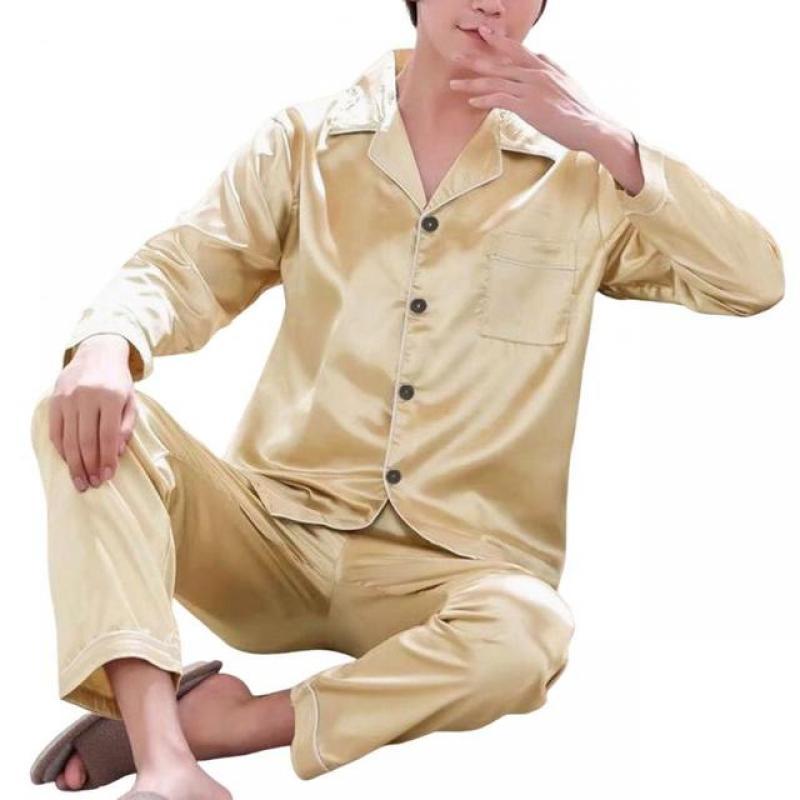1 Set Men Sleepwear Solid Color Long Sleeved Single Breasted Home Wear Ice Silk Loose Plus Size Pajamas Set for Home